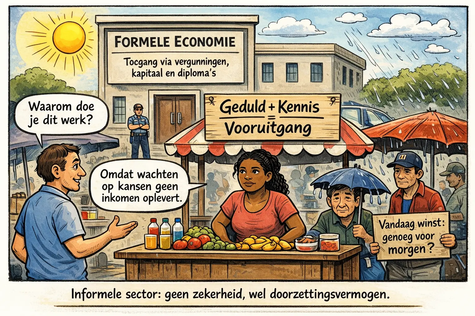 Al meer dan twee jaar staat Shequita dagelijks op haar vaste plek. Net als veel andere straatverkopers werkt zij lange dagen in de zon of regen, zonder garantie op een vast inkomen. Haar verdiensten hangen af van het aantal klanten, de locatie en de algemene economische situatie. De sector kent bovendien tal van uitdagingen, zoals beperkte toegang tot sanitaire voorzieningen, opslagruimte en bescherming tegen slecht weer.