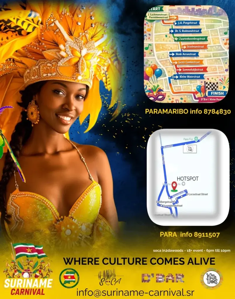De 2026 Suriname Carnival zal op 6 maart groots starten te D-BAR in Paramaribo, waarna op 7 maart de Road Show te Paramaribo zal plaatsvinden, op zondag 8 maart de Road Show te Para, met als sluitstuk de traditionele afsluiting bij āIn2 Da Woodsā aan de Meursweg in het district Para.