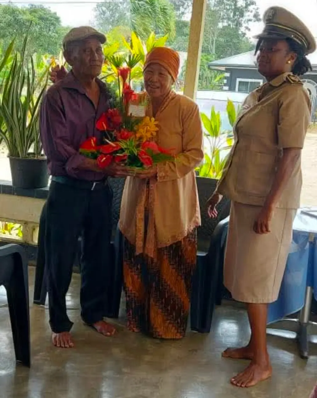 Het echtpaar Wirongali-Projogolo werd op 25 februari in de bloemetjes gezet vanwege hun 50-jarig huwelijksjubileum in Commewijne. Districtssecretaris mevrouw Leter vertegenwoordigde de districtscommissaris en bracht de hartelijke gelukwensen over namens de regering.