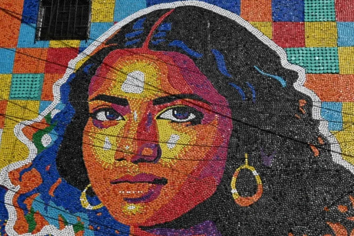 Een enorme muurschildering gemaakt van plastic flesdoppen toont de Latijns-Amerikaanse versie van de beroemde Mona Lisa. Deze siert een bescheiden appartementencomplex in een arbeiderswijk buiten de hoofdstad van El Salvador.