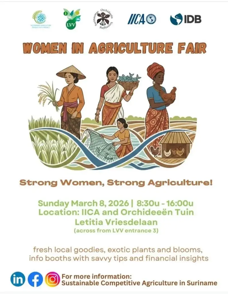 Op het terrein van de ICCA (Inter-Amerikaanse Coöperatie voor Landbouw) en de Surinaamse Orchideeënvereniging werd zondag 8 maart een Women in Agriculture Fair gehouden. Andere betrokken organisaties waren het ministerie van Landbouw, Veeteelt en Visserij, de Inter-American Development Bank en het Sustainable Agriculture Productivity Project.