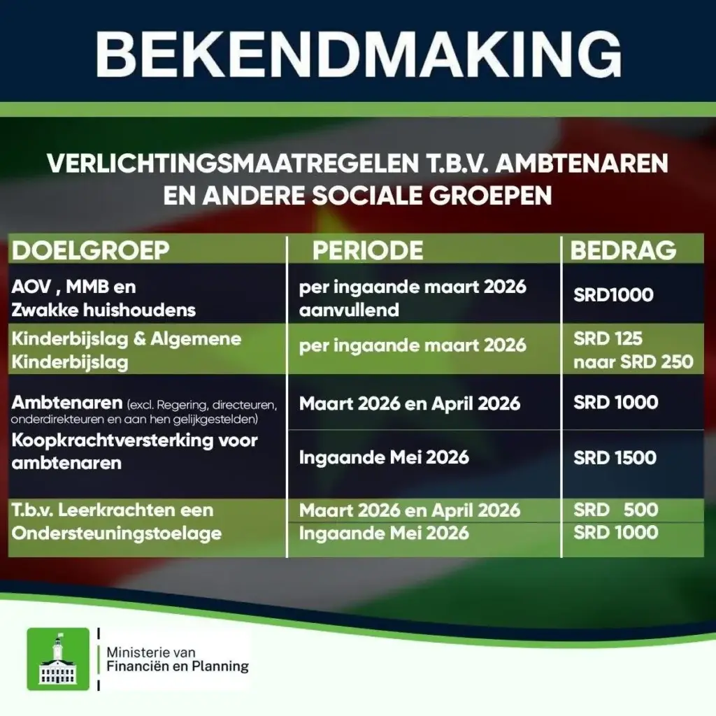 De regering heeft nieuwe financiële maatregelen aangekondigd om de koopkracht van burgers te versterken. Verschillende groepen krijgen extra geld. AOV, MMB en zwakke huishoudens ontvangen SRD 1000 extra. De kinderbijslag stijgt van SRD 125 naar SRD 250. Ambtenaren krijgen in maart en april SRD 1000 extra en vanaf mei SRD 1500. Leerkrachten krijgen eerst SRD 500 en daarna SRD 1000 ondersteuning.
