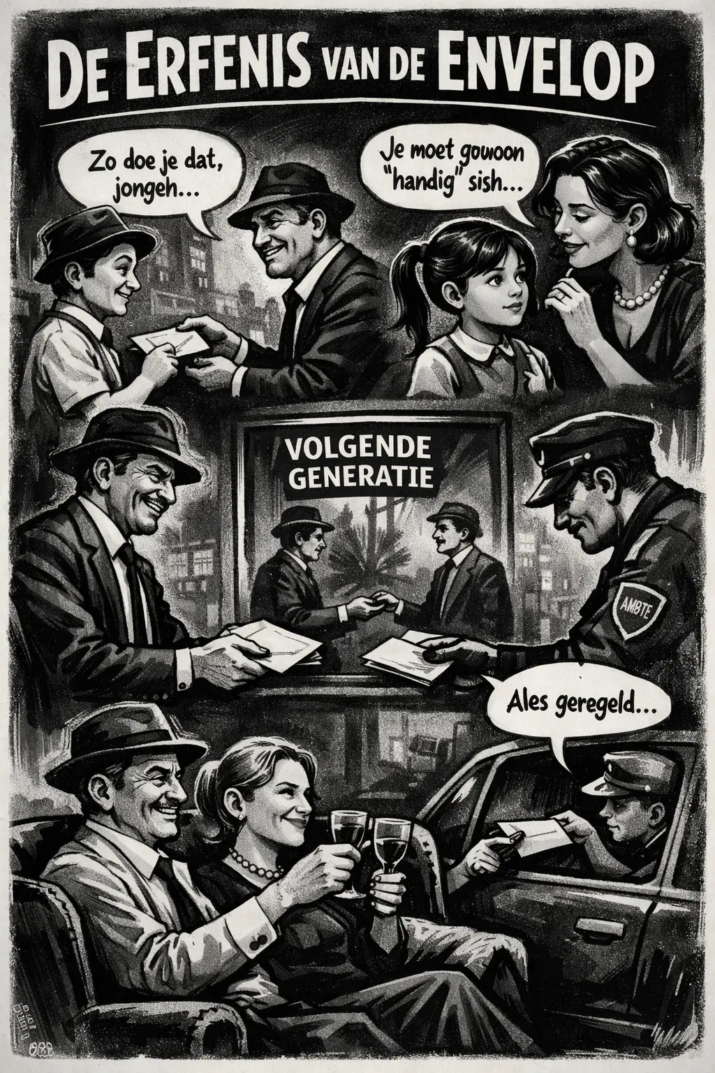 In het gezin Van Alles-Regelt werd corruptie nooit uitgelegd, maar wel voorgedaan. Vader noemde het “handig zijn”. Moeder sprak over “netwerken”. Wanneer de elektriciteit uitviel, belde vader een kennis. Wanneer een vergunning vastliep, verscheen er een envelop. De kinderen keken toe, leerden snel en stelden geen vragen. Waarom zouden ze ook. Het werkte.