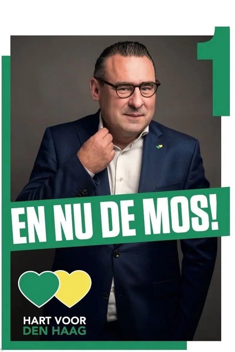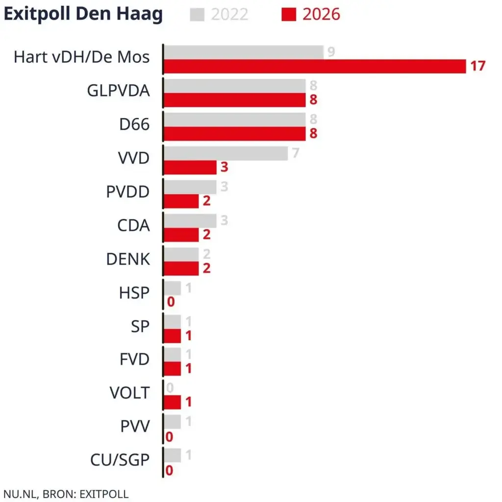 Hart voor Den Haag/De Mos komt uit op 17 zetels, een winst van 8 zetels ten opzichte van 2022. Daarmee wordt de partij met afstand de grootste in de gemeenteraad.