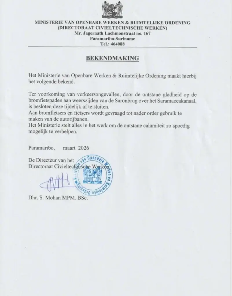 Na een bericht van het commissariaat Paramaribo-Zuid over een aantal ongevallen met bromfietsers op het fietspad van de Saronbrug, heeft het ministerie van Openbare Werken vandaag, dinsdag 24 maart, besloten de fietspaden op die brug tijdelijk af te sluiten.