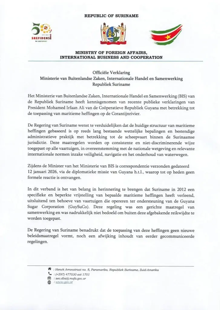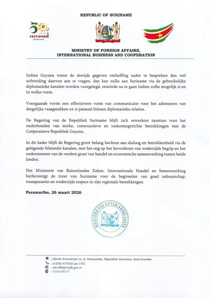 In Paramaribo klinkt een rustige maar duidelijke boodschap. Terwijl woorden over en weer gaan tussen Suriname en Guyana, kiest de regering voor uitleg in plaats van escalatie.