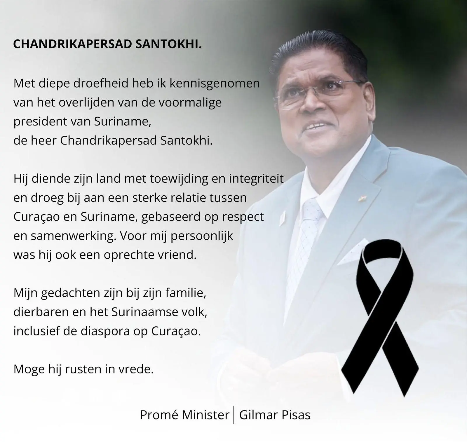 De premier van Curaçao, Gilmar Pisas, heeft met diepe droefheid gereageerd op het overlijden van voormalig president Chandrikapersad Santokhi.