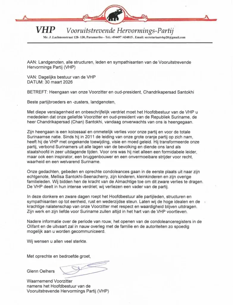 Met diepe verslagenheid en onbeschrijfelijk verdriet moet het Hoofdbestuur van de VHP u mededelen dat onze geliefde Voorzitter en oud-president van de Republiek Suriname, de heer Chandrikapersad (Chan) Santokhi, vandaag onverwachts van ons is heengegaan.