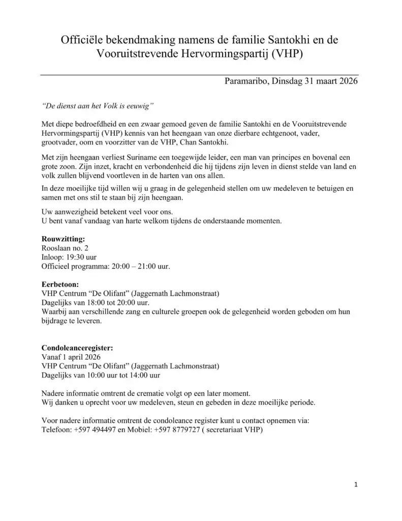 Met diep verdriet neemt de VHP afscheid van een toegewijde leider en grote zoon van Suriname. Wij nodigen eenieder uit samen stil te staan bij zijn leven, inzet en nalatenschap, en medeleven te betuigen tijdens de aangekondigde rouwmomenten.