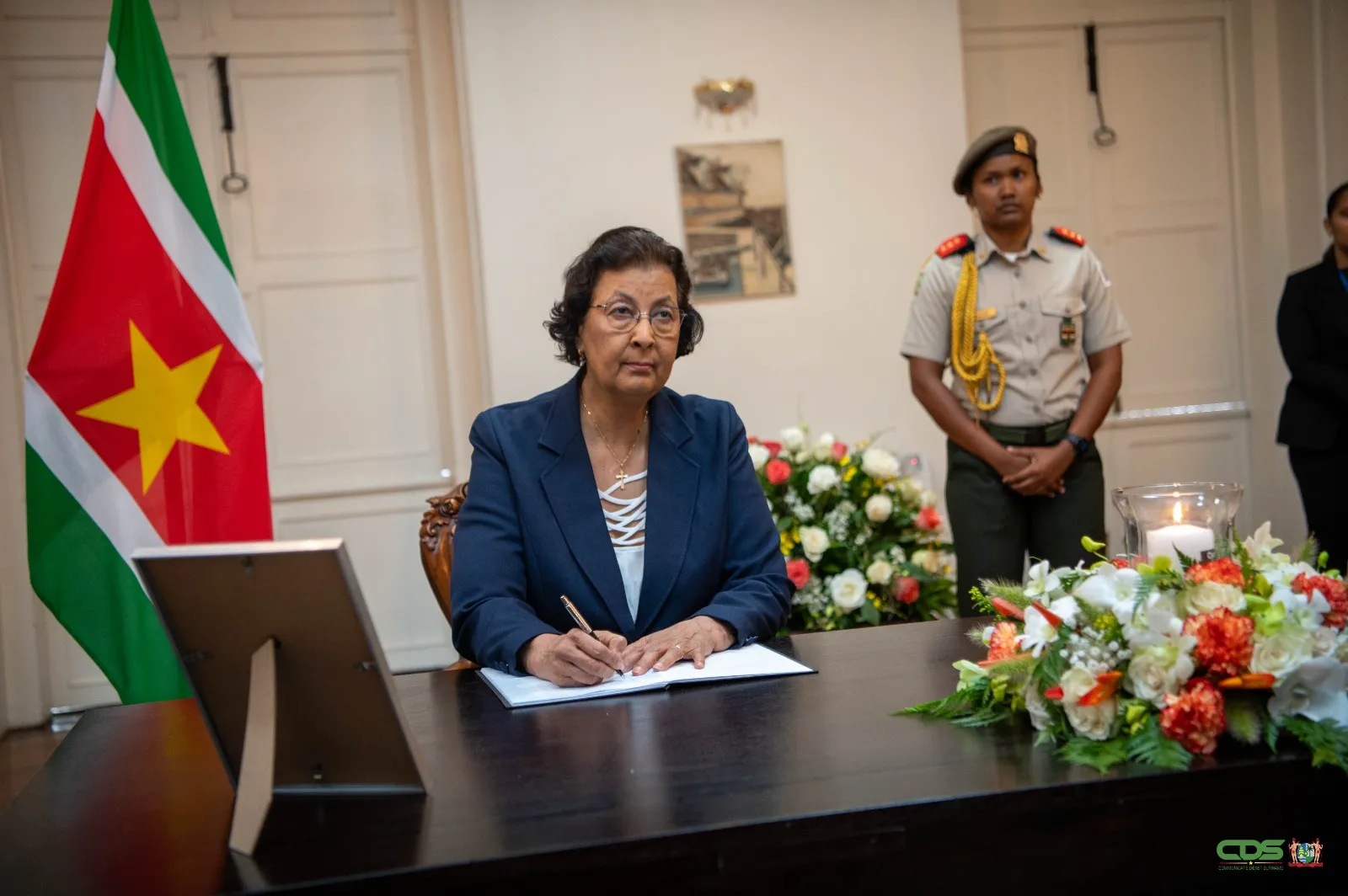 President Jennifer Simons heeft het condoleanceregister voor Chan Santokhi getekend op het Presidentieel Paleis.
