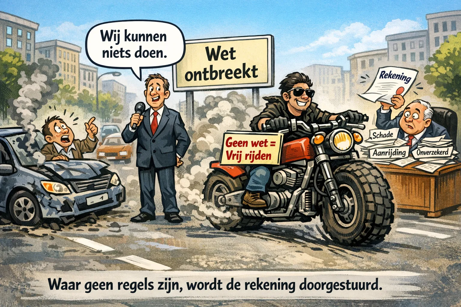 De logica is opmerkelijk: waar wetgeving ontbreekt, ontstaat geen verantwoordelijkheid. Dat leidt tot een omgekeerde realiteit waarin niet de bestuurder, maar impliciet de staat opdraait voor schade. In deze satirische lezing zou elke botsing met een illegale e-bike automatisch een rekening richting het hoogste gezag sturen, aangezien toezicht en regulering ontbreken.