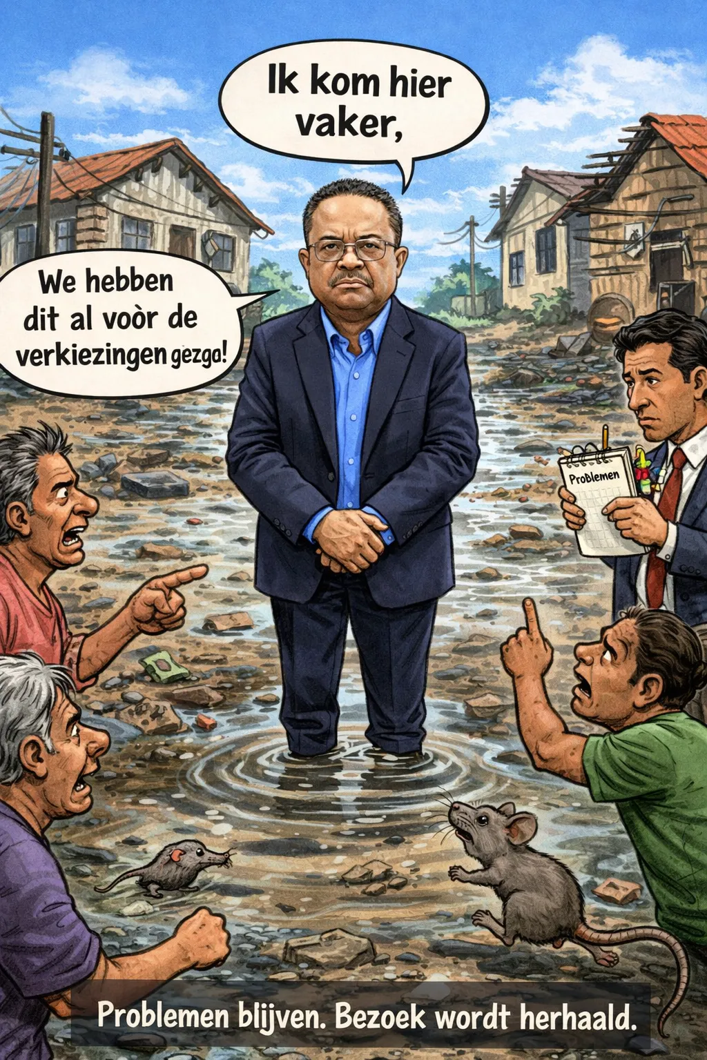 Dezelfde straat. Dezelfde gaten. Dezelfde mensen. Alleen het jasje verandert. Eerst kwam Gregory Rusland als partijleider van de NPS. Notitieboek open. Belofte groot. “Wij gaan dit oplossen.” Iedereen klapte. Iedereen geloofde. De lijst werd langer dan de weg zelf.