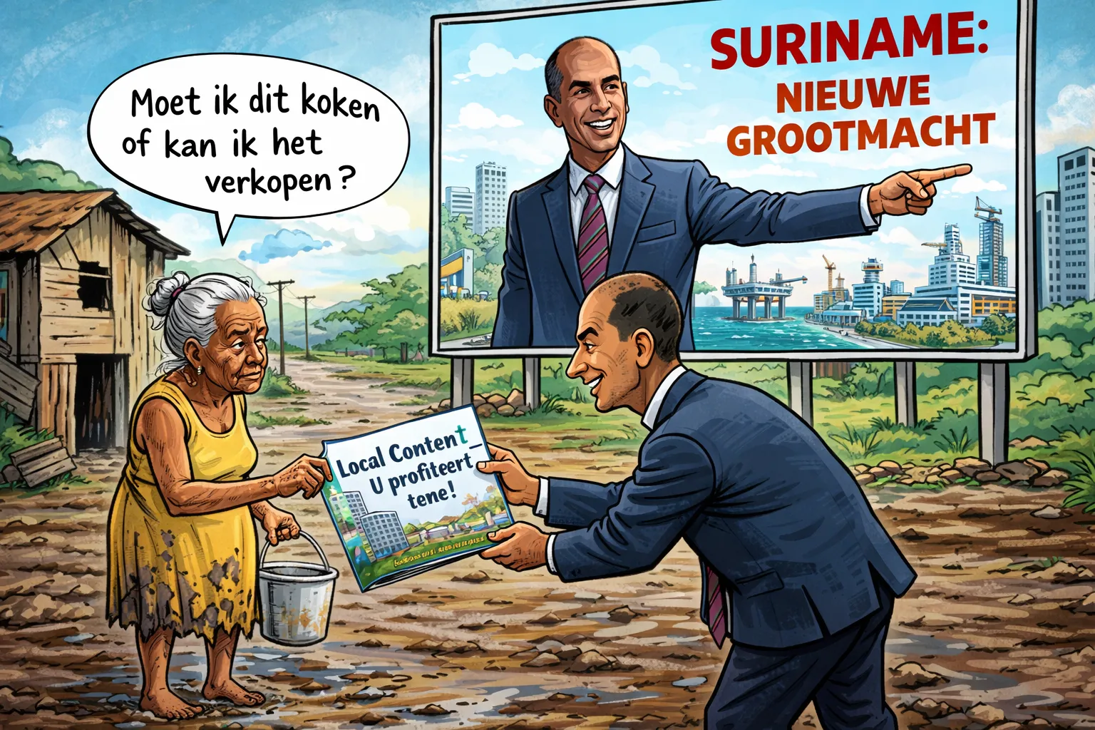 Minister Patrick Brunings van Olie, Gas en Milieu ziet het al voor zich: Suriname als grootmacht. Niet zomaar een land, maar een soort olie-Walhalla met shorebases, appartementen en restaurants die als paddenstoelen uit de grond schieten. De toekomst ruikt naar dollars, zegt men. Alleen jammer dat het verleden nog steeds naar modder ruikt.