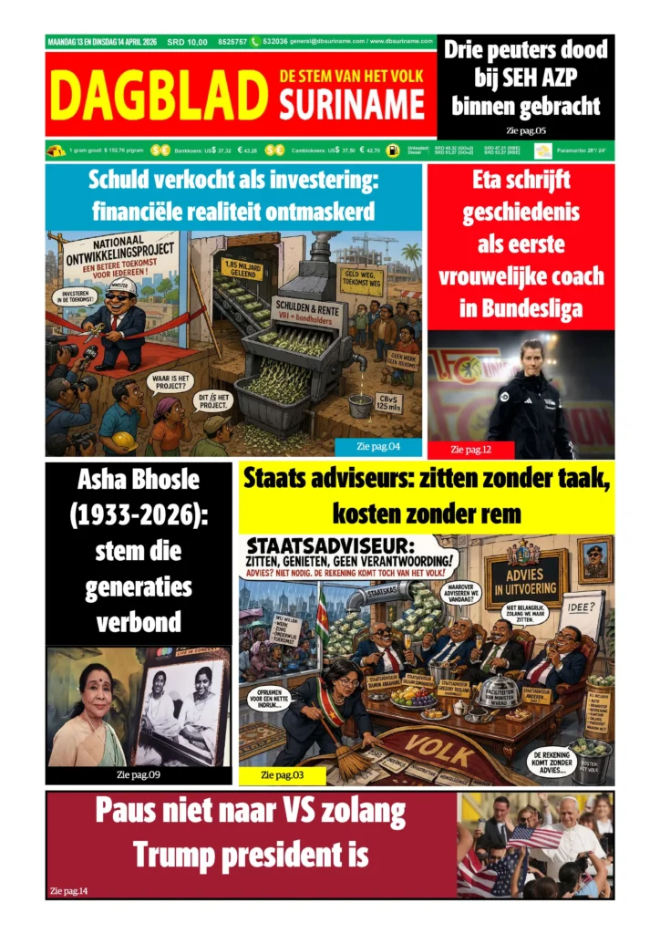 Dagblad Suriname, maandag 13 april 2026 Geplaatst op april 13, 2026april 12, 2026 Bericht navigatie VorigeTV programma overzicht maandag 13 april 2026VolgendePrijzen maandag 13 april 2026