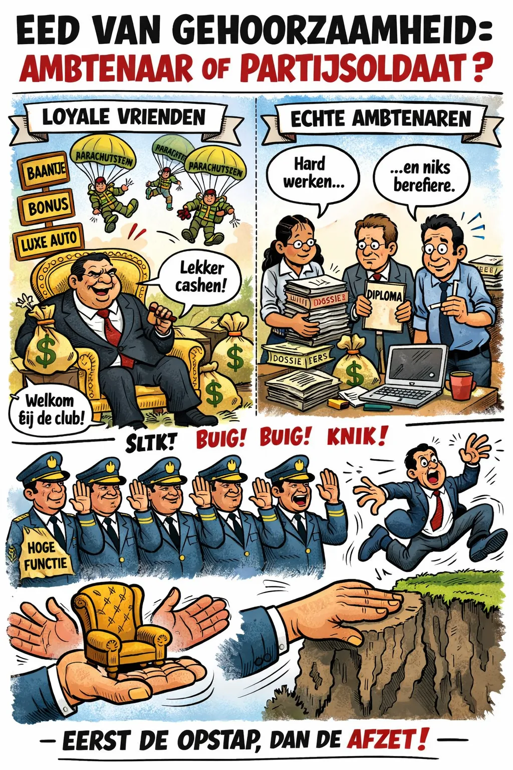 Ondertussen zitten de “parachutisten” al op hun stoelen. Hogere lonen. Minder kennis. Meer connecties. Diploma vervangen door partijkaart. Competentie ingeruild voor loyaliteit.