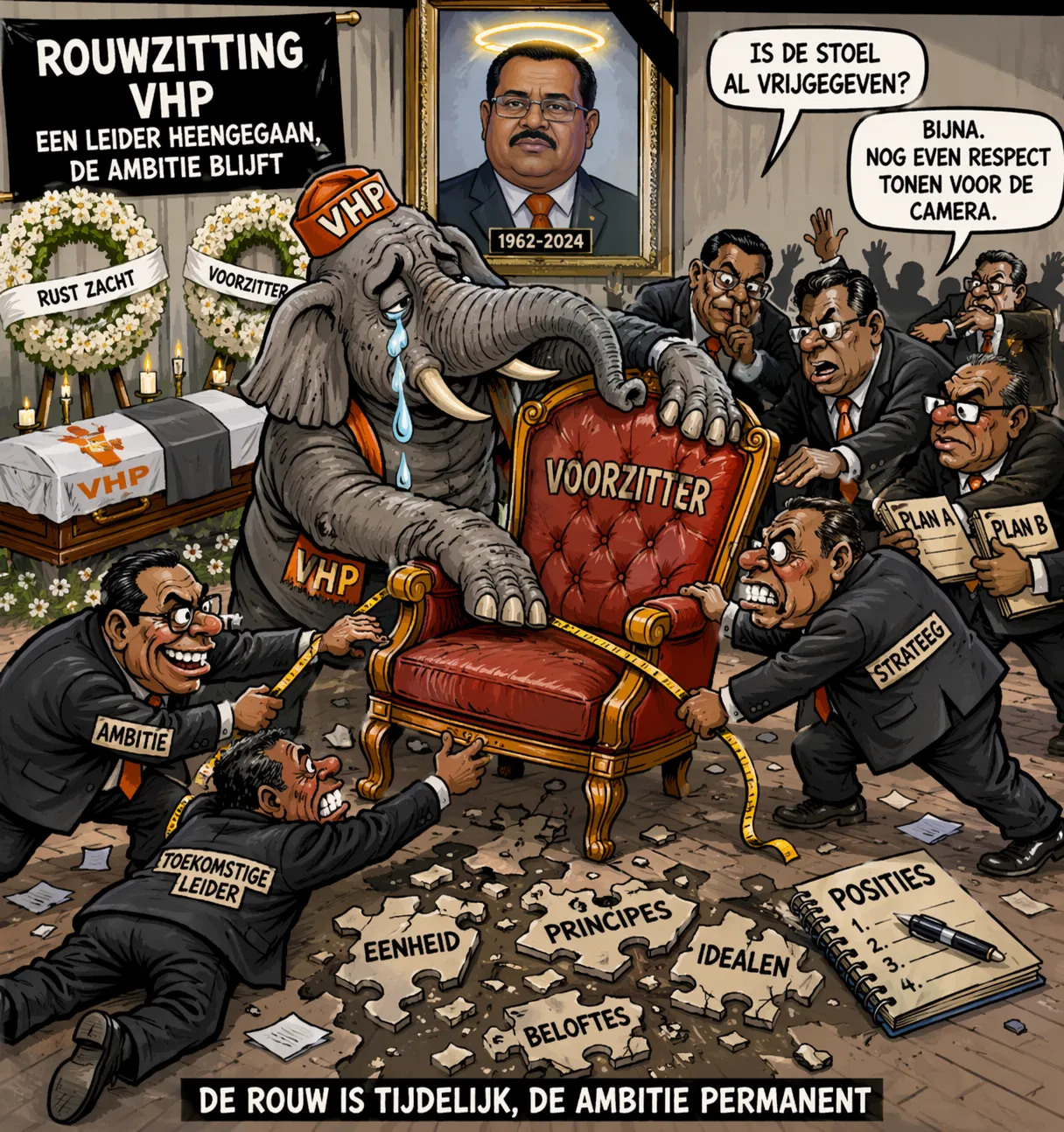 De tranen zijn nog nat, maar de messen al geslepen. In het kamp van de VHP wordt rouw gemengd met rekenwerk. Niet over verlies, maar over stoelen. Wie zit waar. Wie schuift op. Wie duwt wie van de trap.