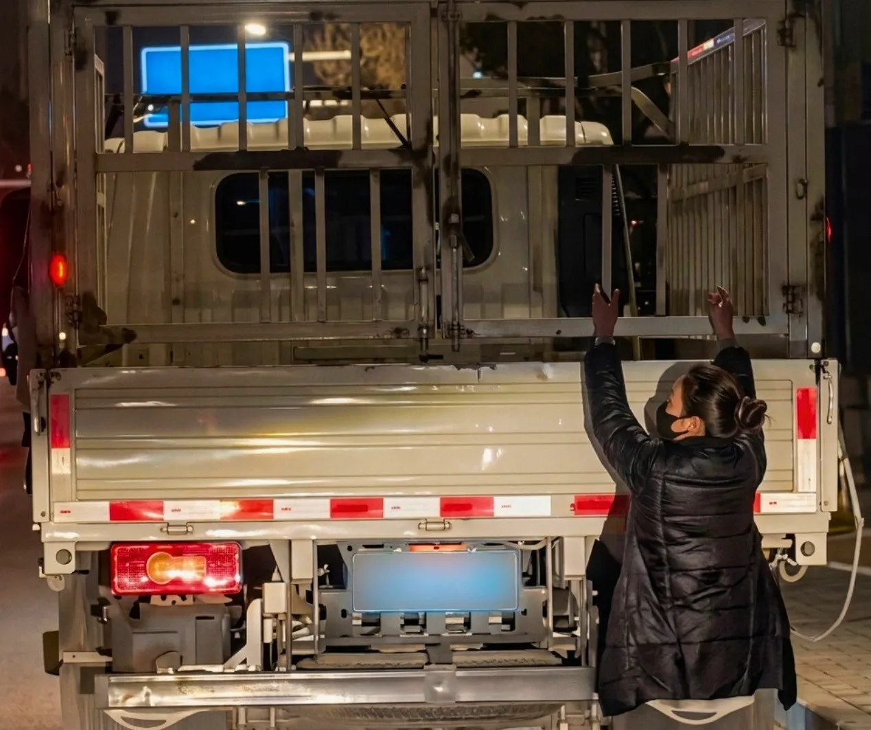 Het bleek om de vrachtwagen van haar man te gaan, die ze probeerde te betrappen op vreemdgaan. De verkeerspolitie in Maralbexi County in Noord-China ontving vorige maand meerdere meldingen van automobilisten over een vrouw die aan de achterkant van een rijdende truck hing. Een team ging naar het gebied en bevestigde de melding.