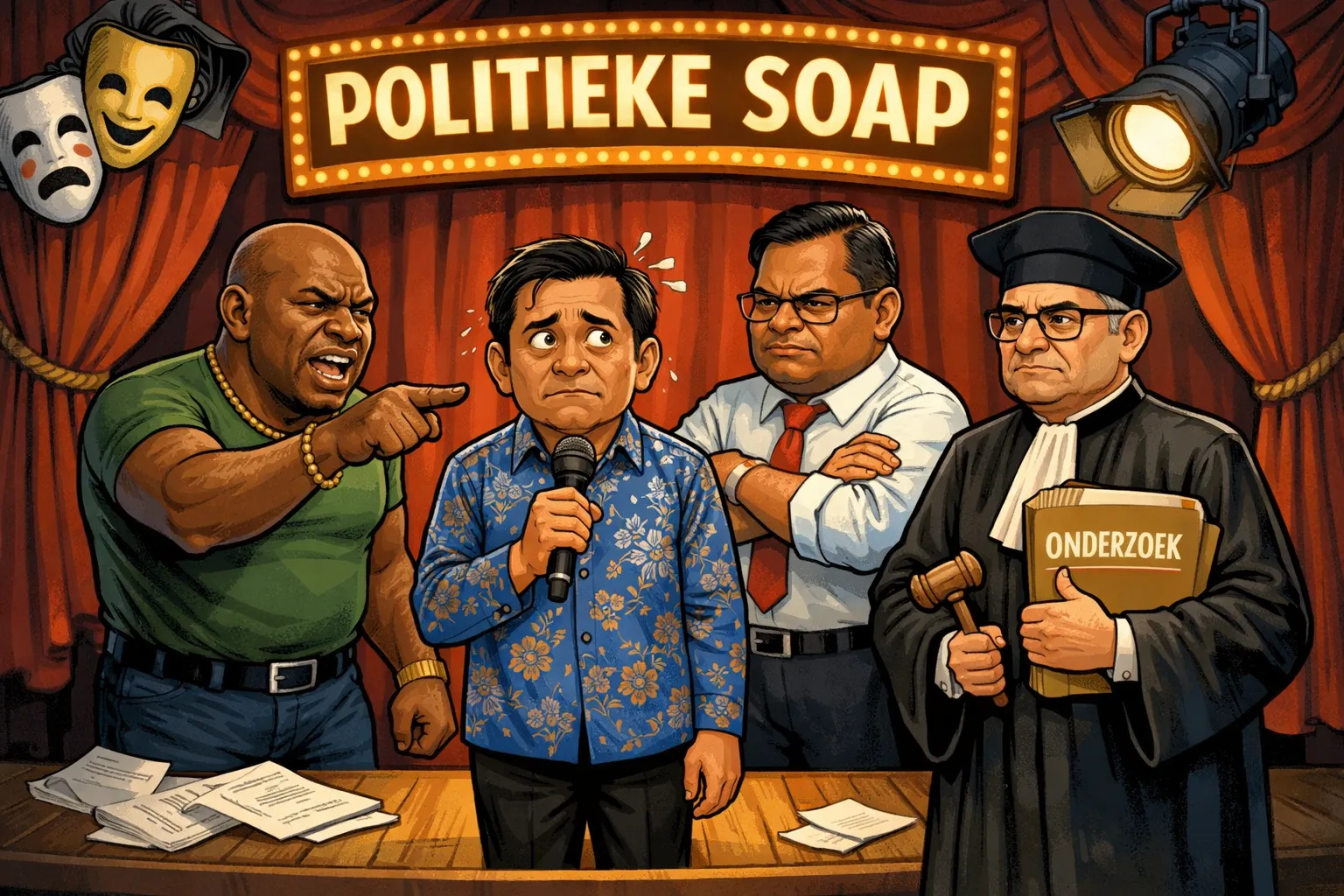 Het begint vaak met stoere taal, stevige beschuldigingen en een flinke dosis politieke spierballentaal, maar zodra onderzoeken op tafel verschijnen, verandert de toon van opera naar fluisterstand. Eerst is er conflict met Ronnie Brunswijk, daarna met Chandrikapersad Santokhi, en uiteindelijk zelfs met het Openbaar Ministerie. Als dit een sport was, zou het een estafette zijn van ruzies, waarbij het stokje telkens wordt doorgegeven aan de volgende tegenstander.