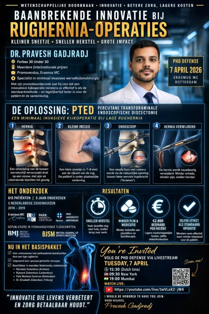 De Surinaams-Hindoestaanse arts Pravesh Gadjradj, opgenomen in Forbes 30 Under 30 en winnaar van meerdere (inter)nationale prijzen, promoveert aan het Erasmus MC in Rotterdam op innovaties in de behandeling van lage rughernia’s. Uit zijn promotieonderzoek blijkt dat een kijkoperatie, de zogenoemde Percutane Transforaminale Endoscopische Discectomie (PTED), minstens net zo effectief is als de standaardoperatie.