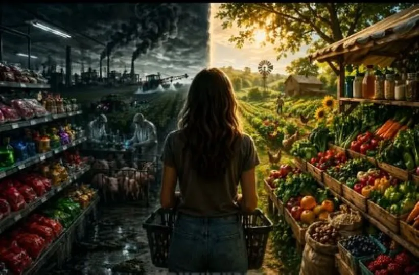 Loop een supermarkt binnen en je betreedt een laboratorium. Geen boerderij. Geen keuken. Een fabriek met TL-licht. Alles glanst. Alles schreeuwt. Alles belooft gezondheid terwijl het klinkt als een scheikundeles.