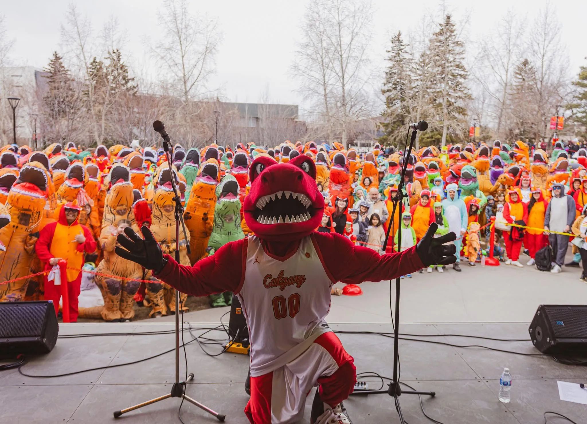 De Universiteit van Calgary, waarvan de sportteams bekend staan als de Dino’s, verzamelde zaterdag 11 april mensen verkleed als verschillende dinosaurussen voor de Taylor Family Digital Library.