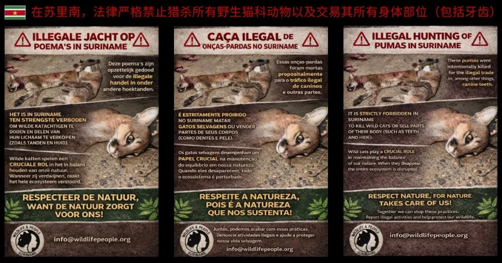 “Het is tragisch hoe vaak er op grote katachtigen wordt gejaagd in Suriname. Deze prachtige dieren worden gedood, in de meeste gevallen slechts om de twee hoektanden te verkopen in de illegale handel. De mensen die dit doen hebben geen respect voor de wilde dieren die zo belangrijk zijn om onze natuur gezond te houden. De jacht op alle katachtigen is verboden volgens de wet in Suriname.”